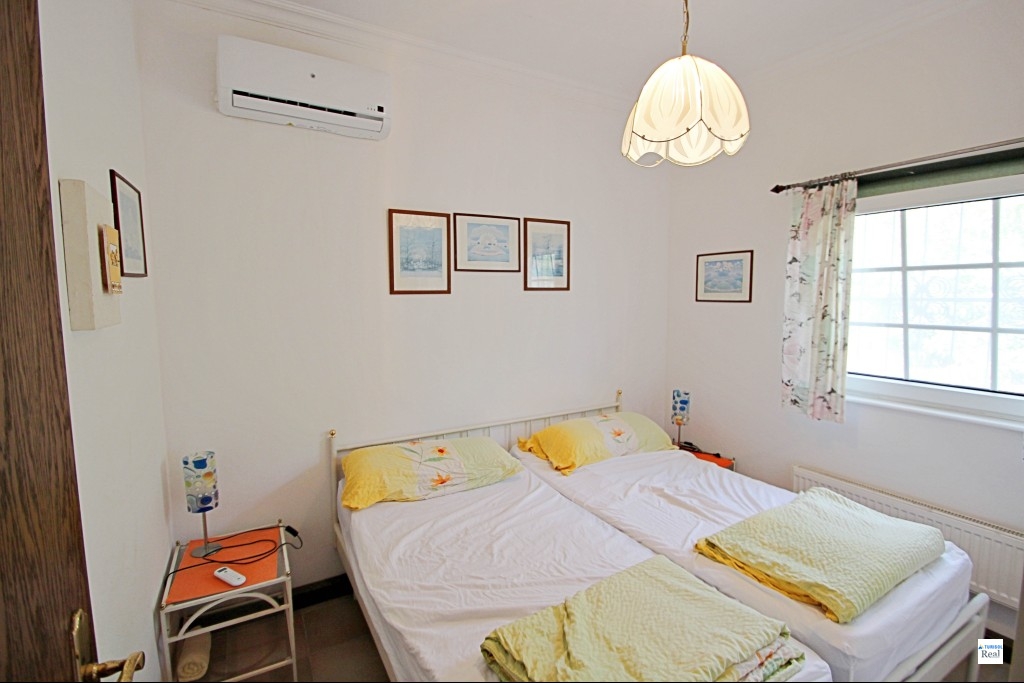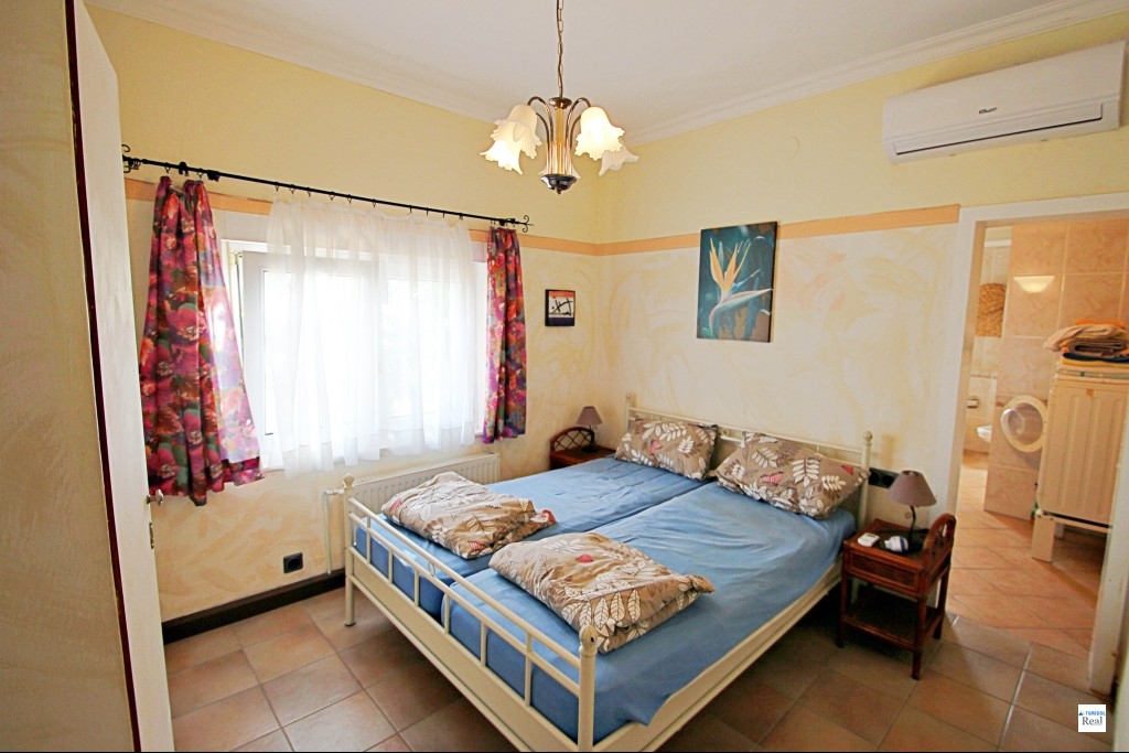 Au-delà des terrasses baignées de soleil, la maison offre une confortable vie de plain-pied. Entrez par une terrasse couverte directement dans le salon lumineux et la cuisine/coin repas attenant, conçue efficacement. La villa comprend trois chambres confortables (toutes avec A/C), deux salles de bains bien aménagées et le chauffage central pour un confort toute l'année.