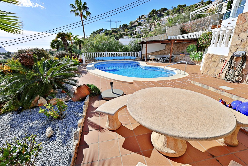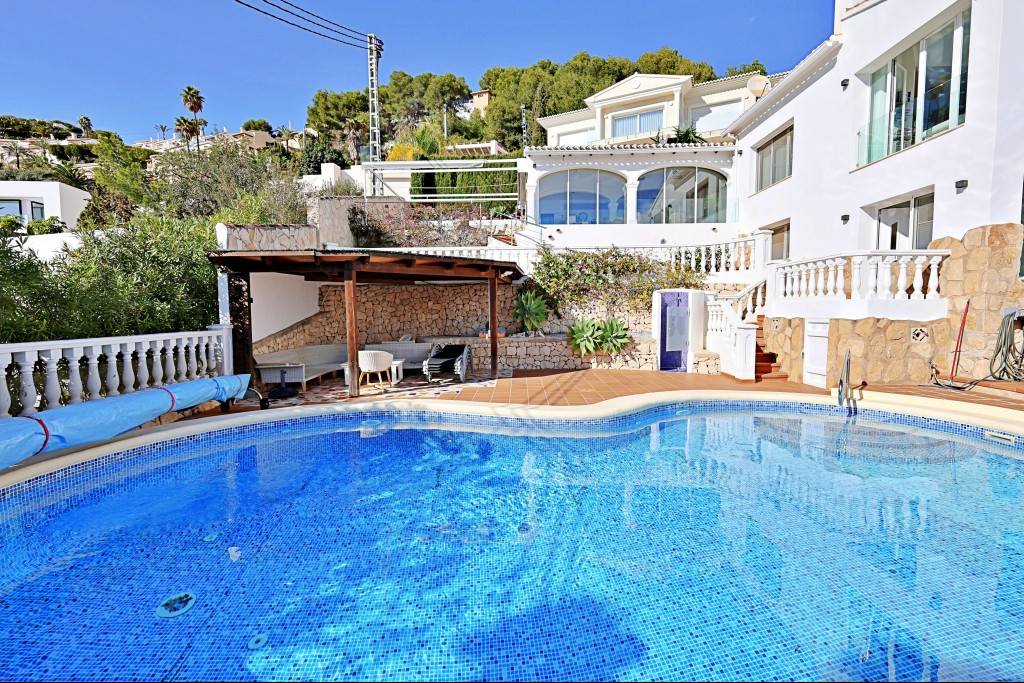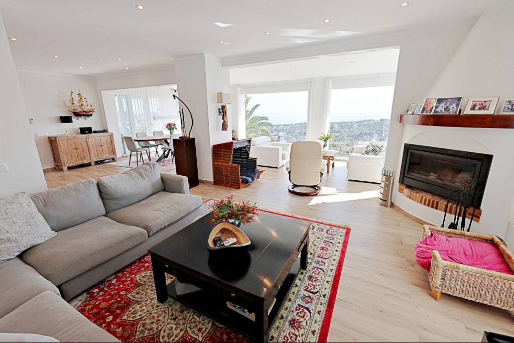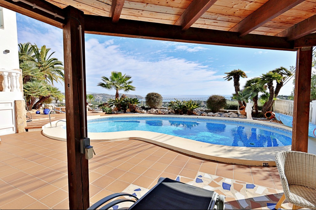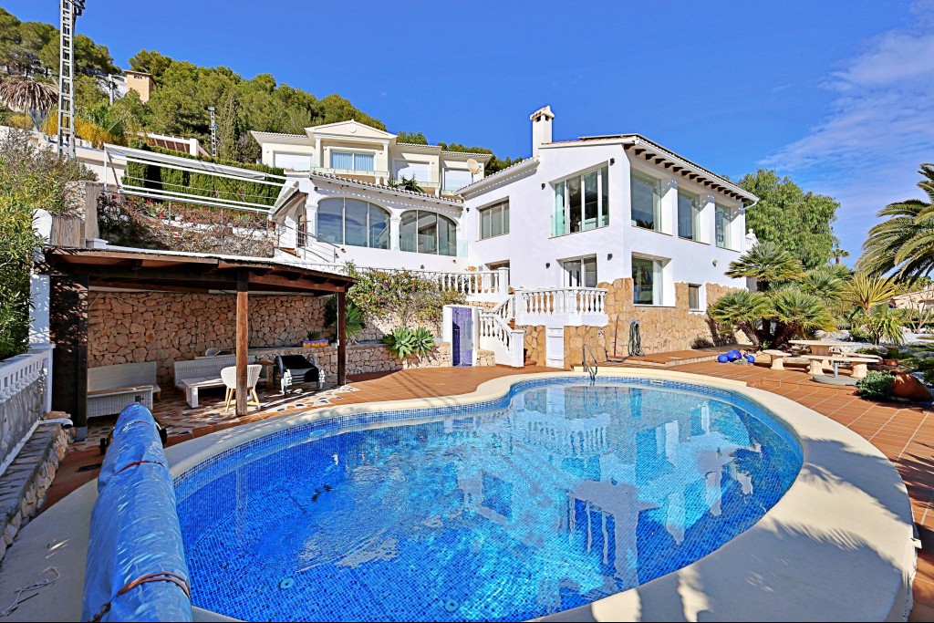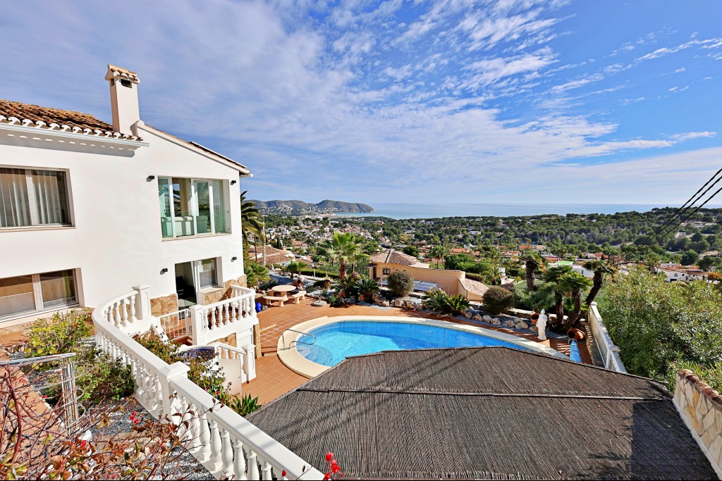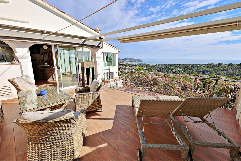 Grote villa met een panoramisch uitzicht van 180º over zee, van Moraira tot Calpe-Ifach. Gelegen op een perceel van 1218 m² met 265 m² woonoppervlak. De villa beschikt over een typisch mediterrane tuin, een groot verwarmd privézwembad, zonnepanelen met accu's en een afgesloten garage.