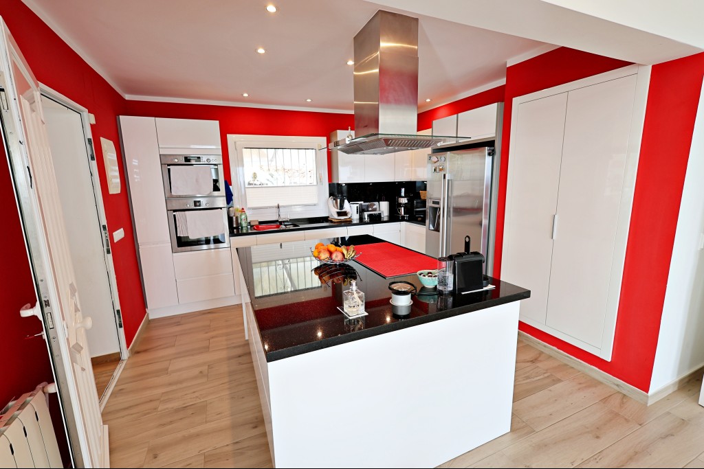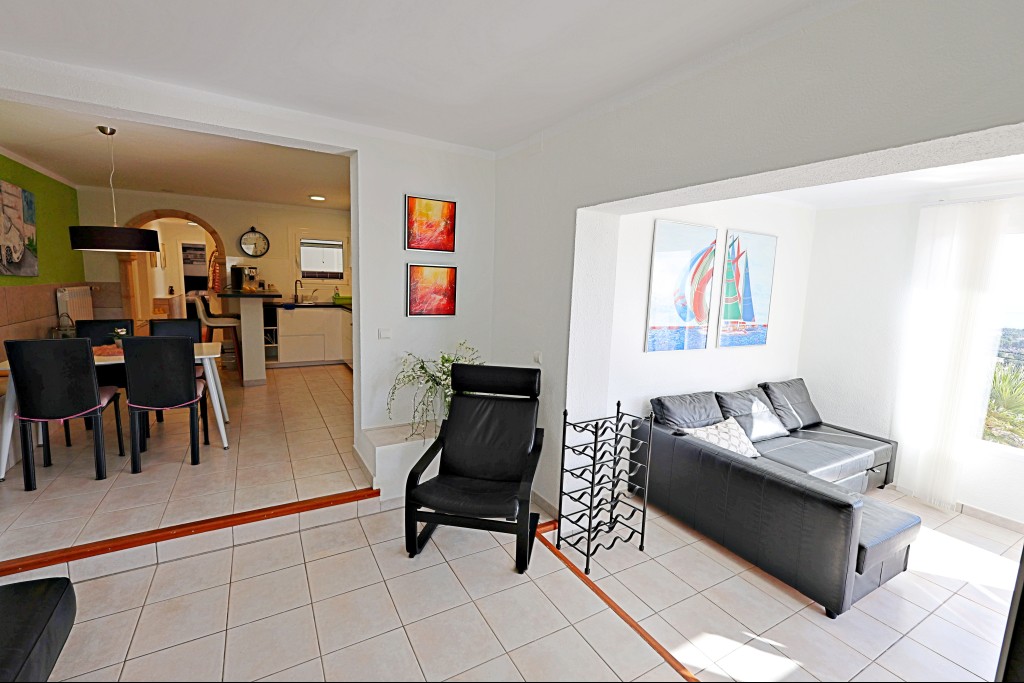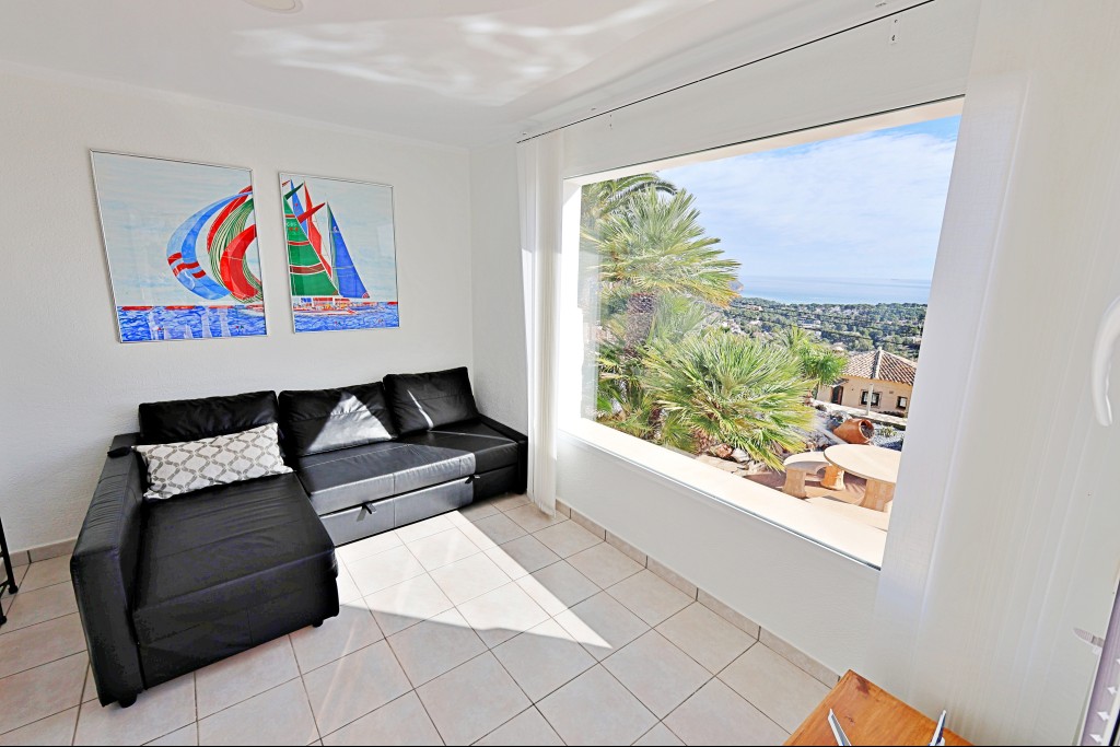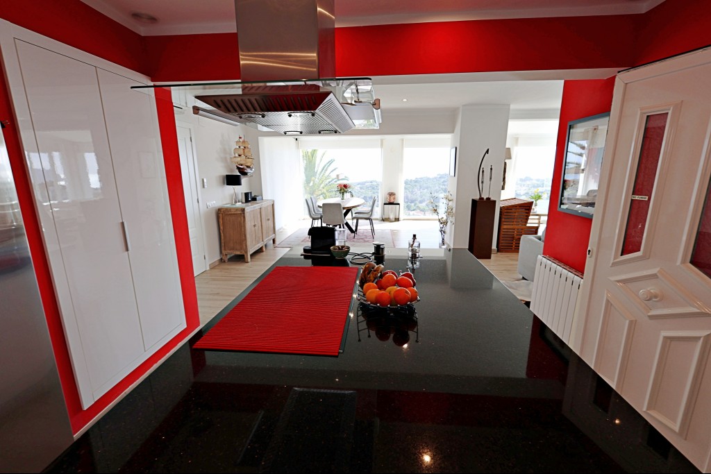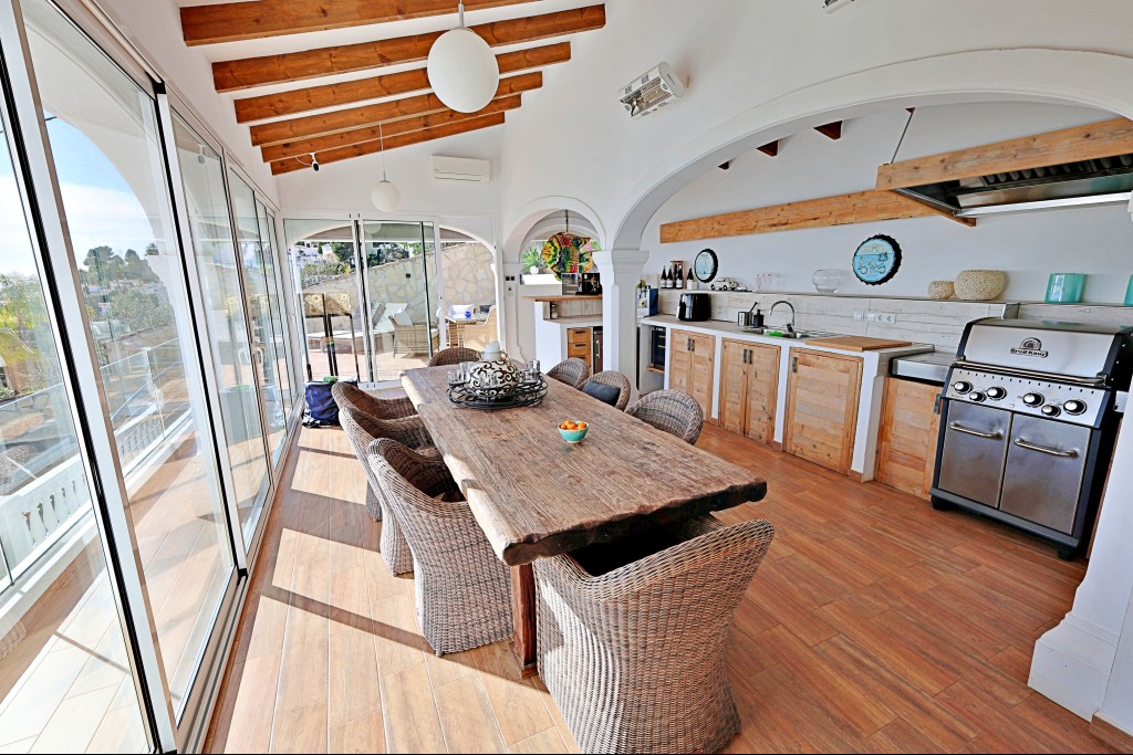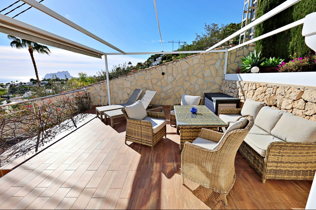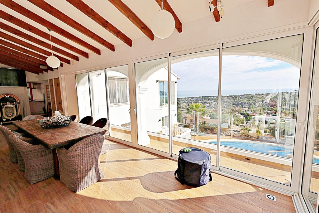 Grote villa met een panoramisch uitzicht van 180º over zee, van Moraira tot Calpe-Ifach. Gelegen op een perceel van 1218 m² met 265 m² woonoppervlak. De villa beschikt over een typisch mediterrane tuin, een groot verwarmd privézwembad, zonnepanelen met accu's en een afgesloten garage.