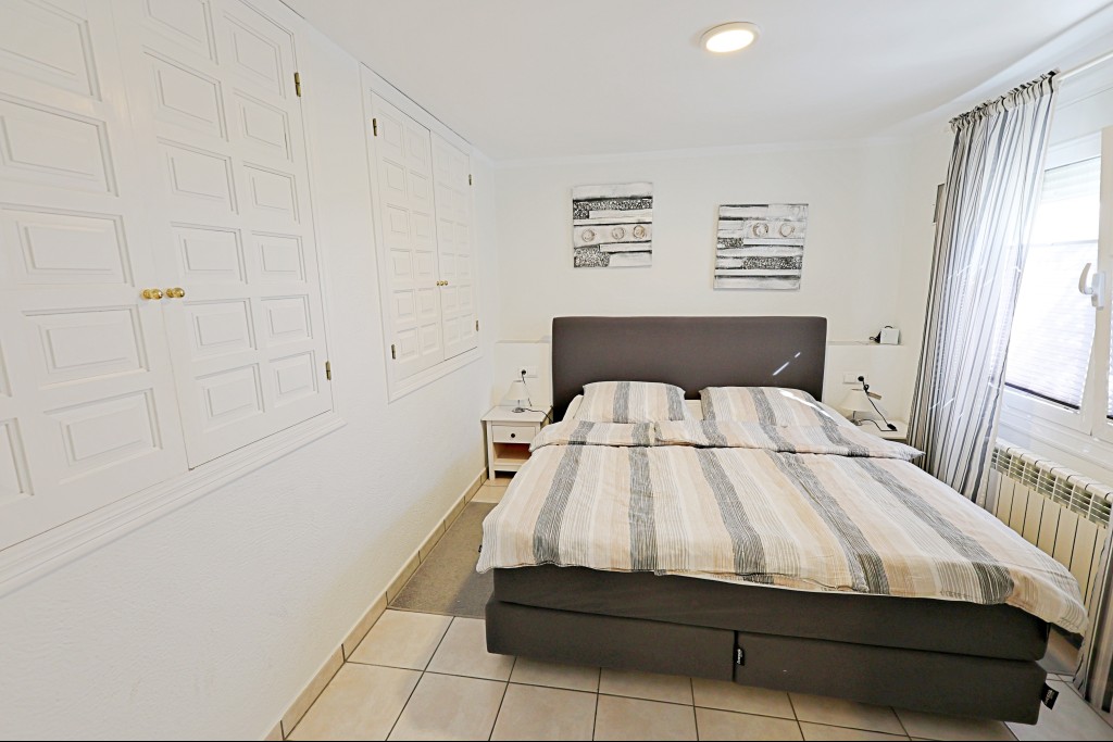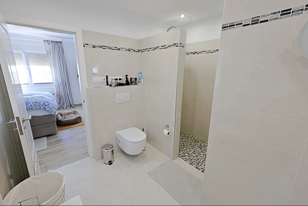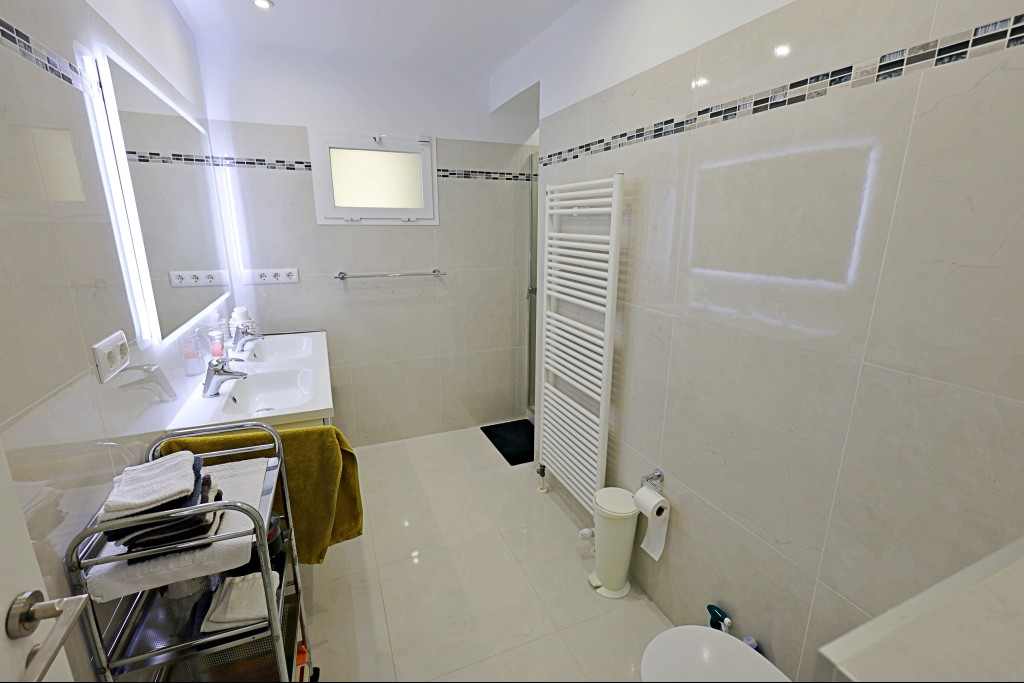 De bovenverdieping van de villa is bereikbaar vanaf de parkeerplaats via een buitentrap en een lift, die toegang geeft tot de woonkamer en de slaapkamers. Er zijn twee slaapkamers met airconditioning die een complete douche delen, en een derde slaapkamer met airconditioning en een eigen douche. De keuken komt uit op een groot, afgesloten balkon met een barbecue/bar en een grote eettafel. Op dezelfde verdieping bevindt zich een open terras met een prachtig uitzicht op zee. Vanuit hier leidt een trap naar het appartement op de begane grond, dat beschikt over een woonkamer met uitzicht op zee, een volledig uitgeruste keuken, een toilet, een badkamer en een slaapkamer met een tweepersoonsbed. Verdere trappen leiden naar het zwembad en het terras, compleet met een schaduwrijk bamboehoekje.